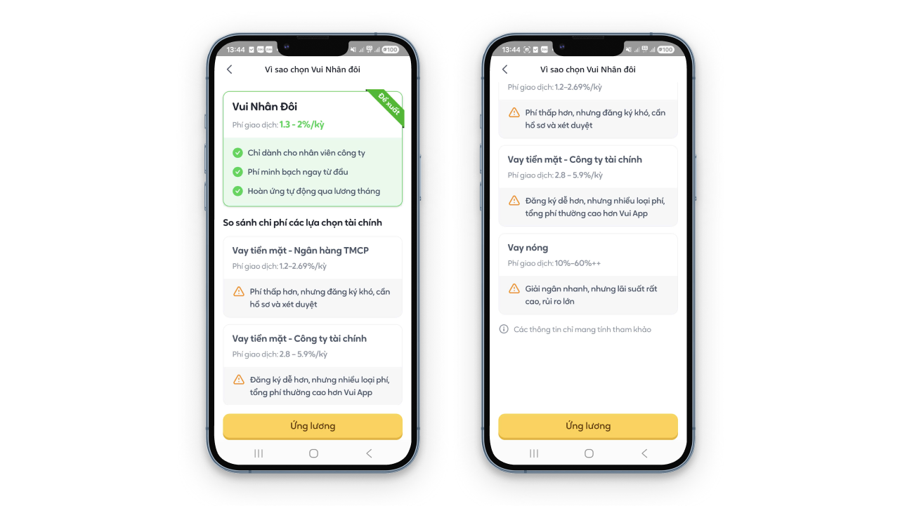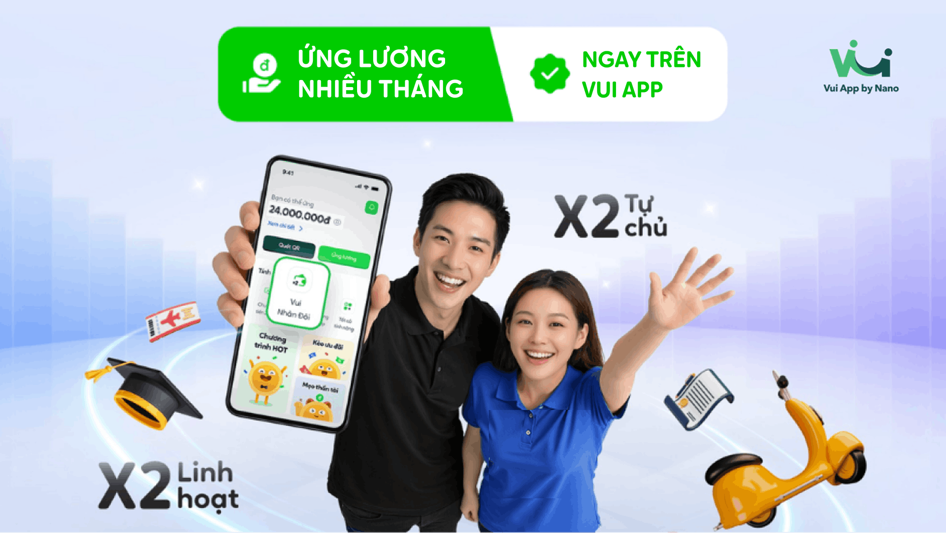 Hạn mức ứng lương đặc biệt: Gấp đôi hoặc gấp ba lần hạn mức ứng trên Thẻ Lương Vui hiện tại. Hạn mức Vui Nhân Đôi sẽ thay đổi tuỳ thuộc vào cấp bậc và vị trí làm việc của cán bộ nhân viên. Chi tiết quyền lợi của từng cán bộ nhân viên được thông báo trong tài khoản Vui App của mỗi anh chị.