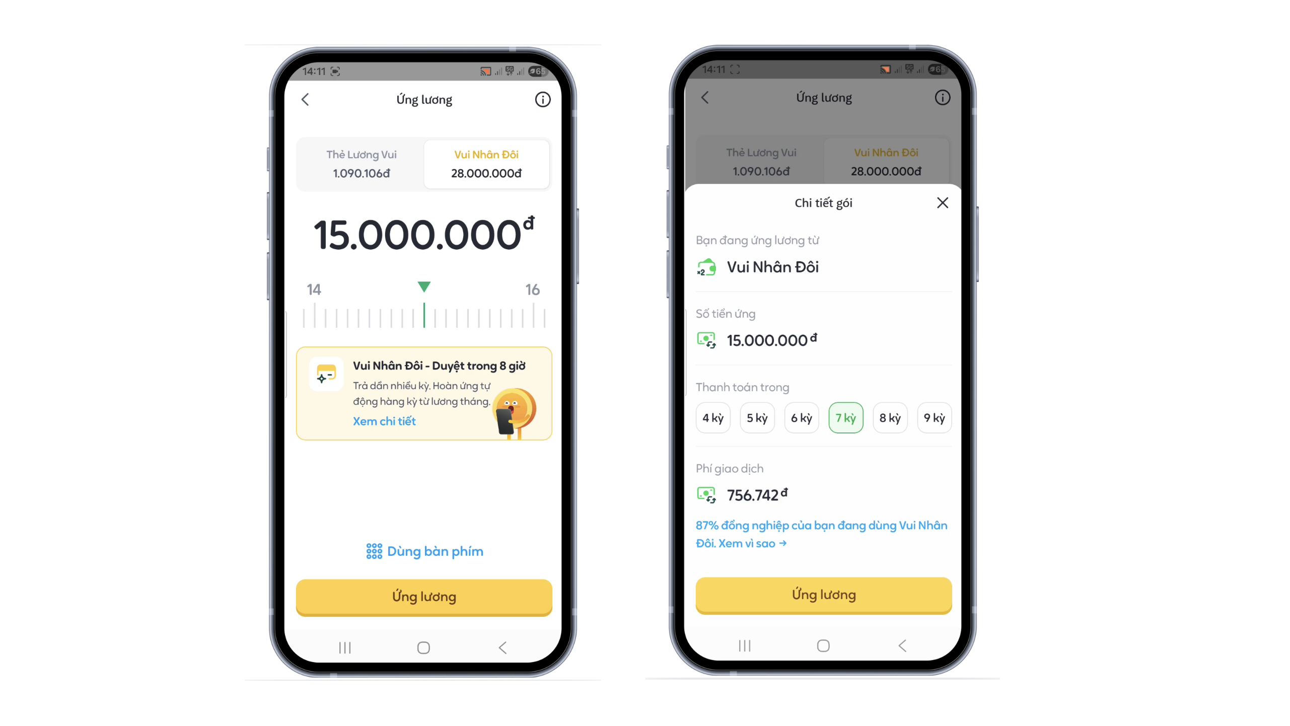 Lưu ý: Hạn mức Vui Nhân Đôi sẽ được thiết lập lại lại theo kỳ. Người dùng vui lòng kích hoạt đơn ứng trước thời hạn (là hạn ứng lương mỗi tháng, được quy định theo chính sách của từng công ty).