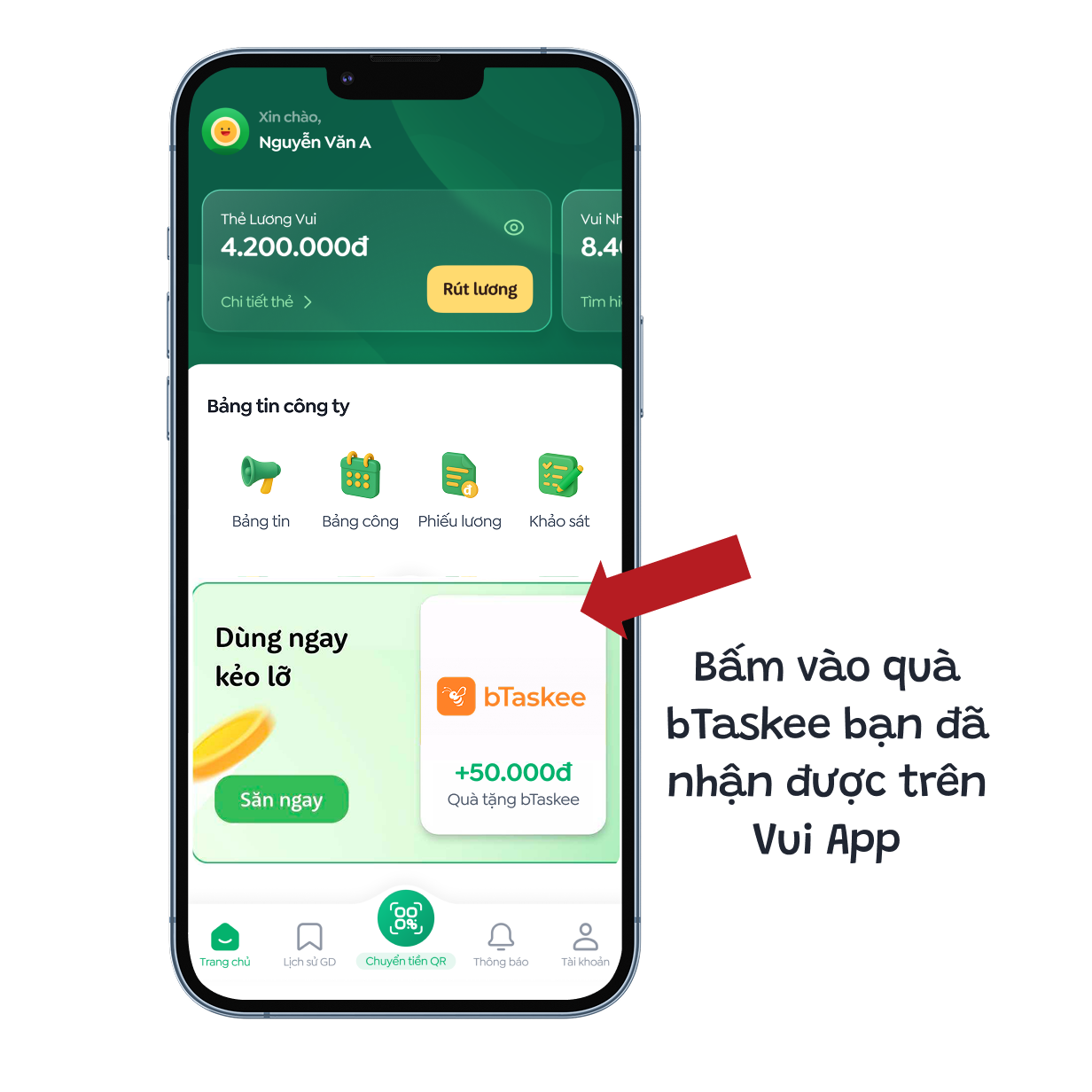 Tại Vui App, mình xem trong mục "Dùng ngay kẻo lỡ", bấm vào ưu đãi bTaskee mà mình đã nhận được.